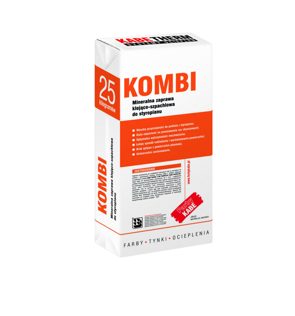 Zaprawa mineralna KOMBI przeznaczona jest do przyklejania płyt styropianowych (EPS) do podłoża oraz do wykonywania warstwy zbrojonej z zastosowaniem siatki z włókien szklanych w systemach ociepleń KABE THERM:
