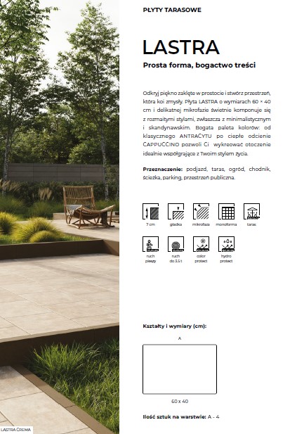 Wyróżnia ją regularny kształt i elegancka, gładka nawierzchnia. Cechuje się dużą odpornością na ścieranie i dobrą przyczepnością. LASTRA przeznaczona jest do wykończenia tarasów, ale z powodzeniem sprawdzi się przy większych powierzchniach. Pozwala stworzyć oryginalną kompozycję z niepowtarzalnym klimatem.