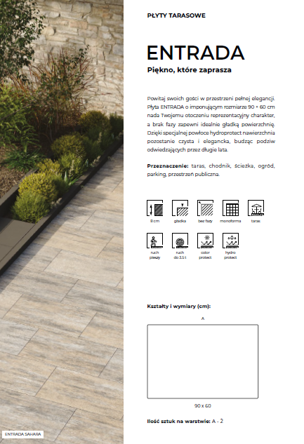 Duże płyty ENTRADA, dzięki swoim wymiarom nadają się idealnie na przydomowe podjazdy, altany i wiaty. Ich masywna konstrukcja oraz wykorzystanie nanofazy pozwalają na uzyskanie perfekcyjnie gładkiej nawierzchni, której zwieńczeniem mogą być równie eleganckie stopnie schodowe Ariba z najnowszej kolekcji BRUK Premium.