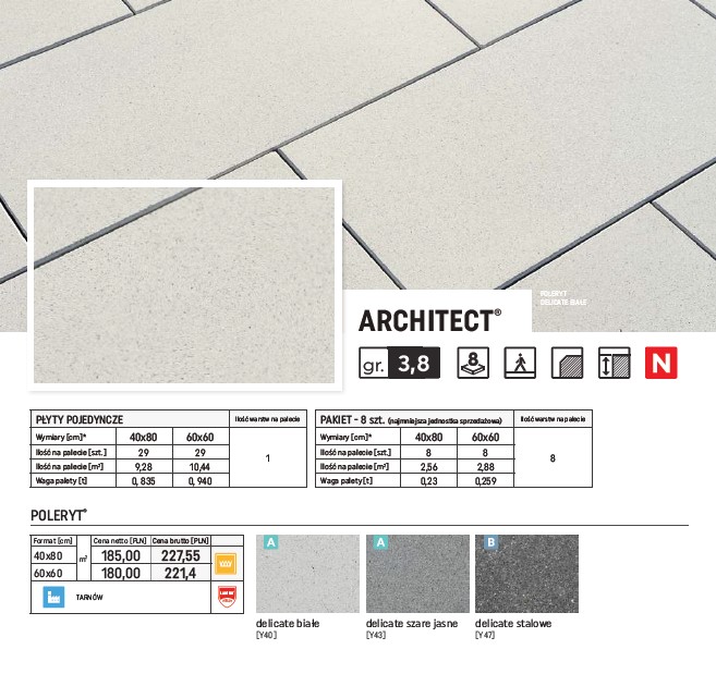 Prostota, elegancja, minimalizm – trzy słowa, w których zamyka się charakterystyka płyt Architect®, przenoszą w świat stylowych aranżacji. Surowa forma w połączeniu z niezwykle przemyślaną gamą kolorystyczną, oraz trzema rodzajami wykończeń powierzchni sprawiają, że płyty są wyszukaną propozycją dla strefy tarasowej i ogrodowej, w której liczy się każdy detal. Płyty posiadają gładką powierzchnię i lekko sfazowane krawędzie.
